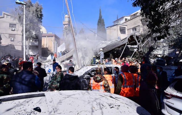 Socorristas y soldados se encuentran en el lugar de un edificio residencial tras un presunto ataque israelí en el barrio de Mezzah, Damasco, Siria. EFE/EPA/STR