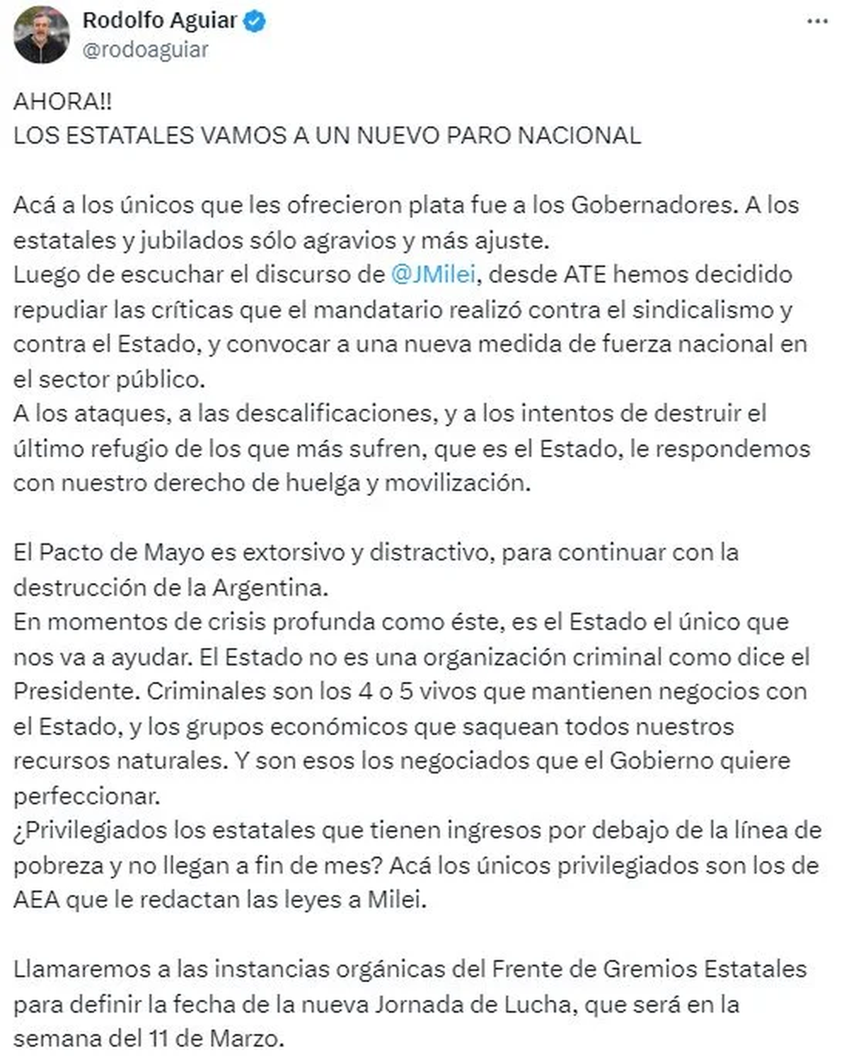 «Acá a los únicos que les ofrecieron plata fue a los Gobernadores. A los estatales y jubilados sólo agravios y más ajuste. Luego de escuchar el discurso de Javier Milei, desde ATE hemos decidido repudiar las críticas que el mandatario realizó contra el sindicalismo y contra el Estado, y convocar a una nueva medida de fuerza nacional en el sector público. A los ataques, a las descalificaciones, y a los intentos de destruir el último refugio de los que más sufren, que es el Estado, le respondemos con nuestro derecho de huelga y movilización«, tuiteó el secretario General de ATE, Rodolfo Aguiar.