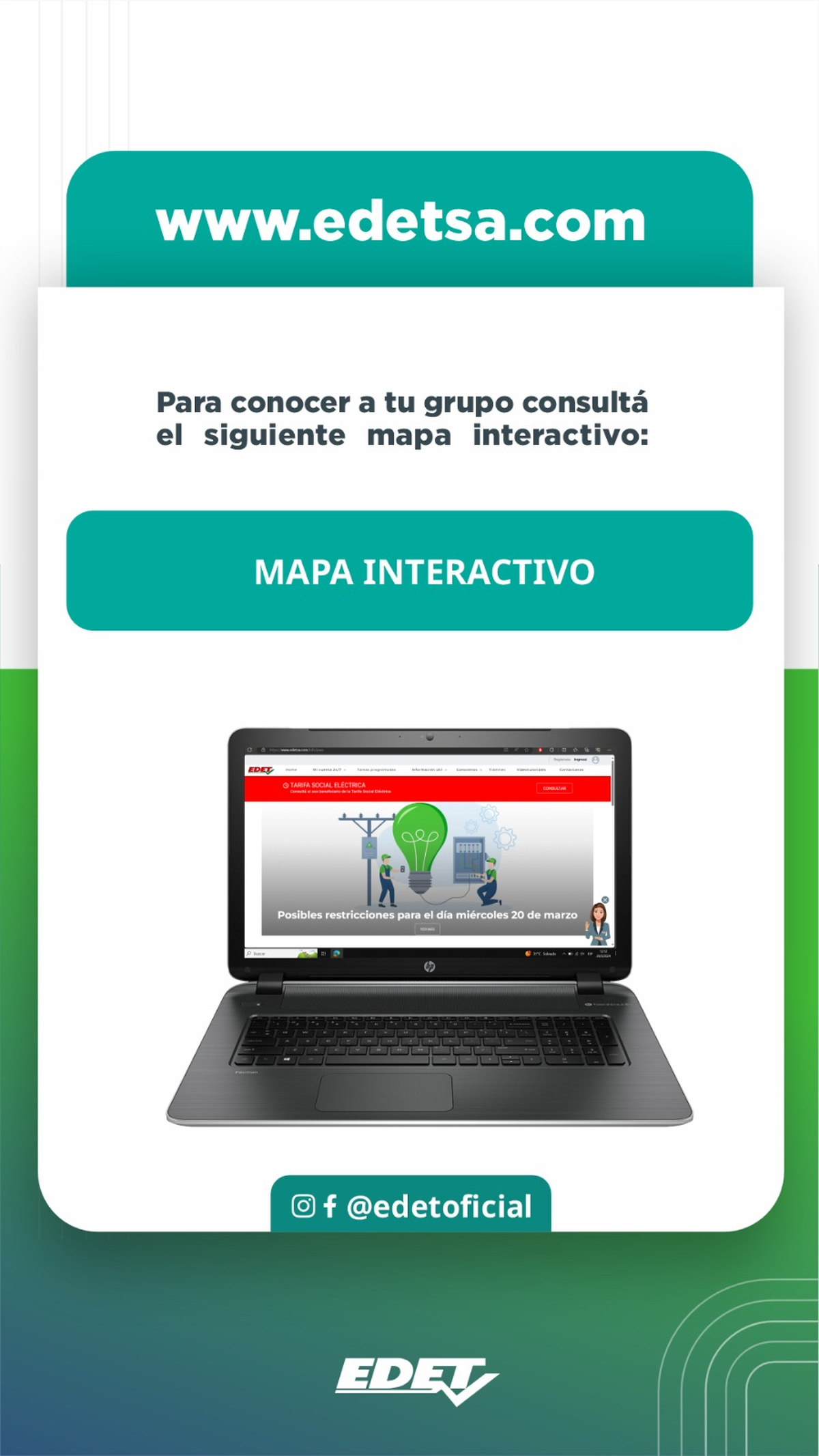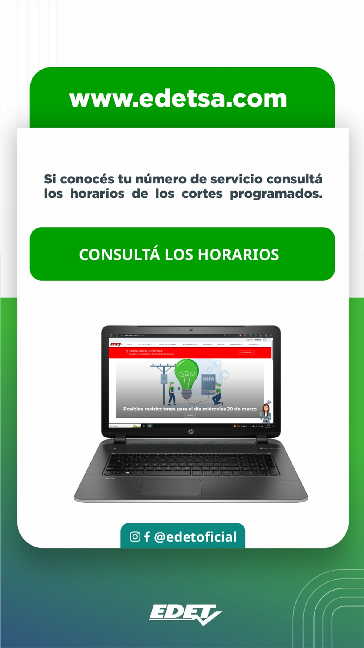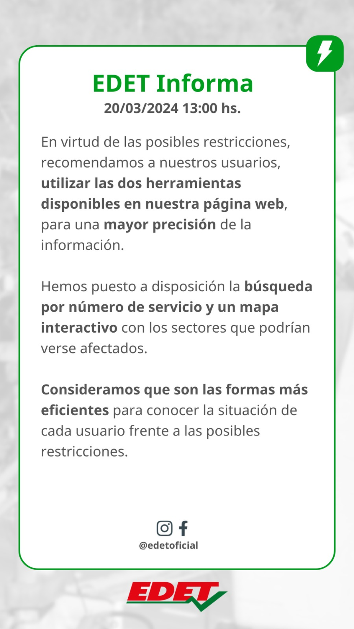 En virtud de las posibles restricciones en el servicio de energía eléctrica, desde EDET recomendaron a los usuarios utilizar las dos herramientas disponibles en la página web, para una mayor precisión de la información.