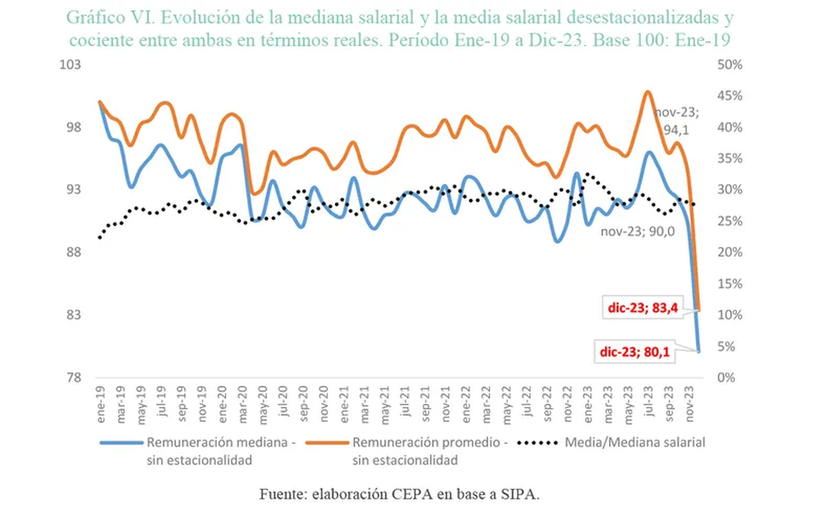 En este escenario dramático, desde el CEPA también alertaron sobre la caída de los salarios correspondientes al mes de diciembre 2023: «Los salarios, medidos tanto por promedio como por mediana, se derrumbaron 11% en términos reales en tan solo un mes, en una caída sin precedentes», enfatizaron desde la organización.