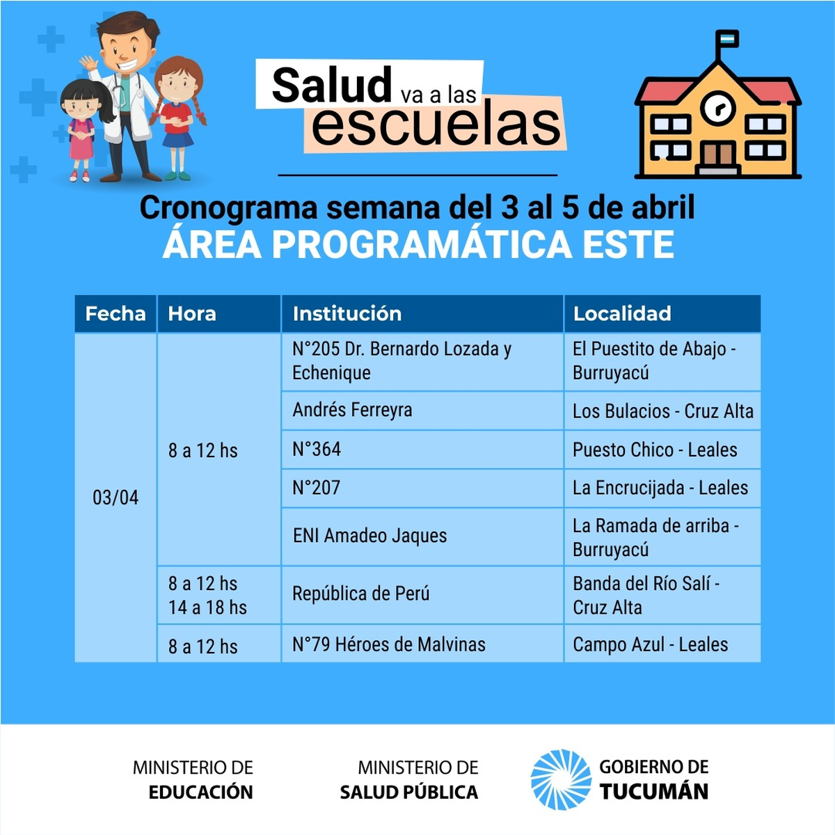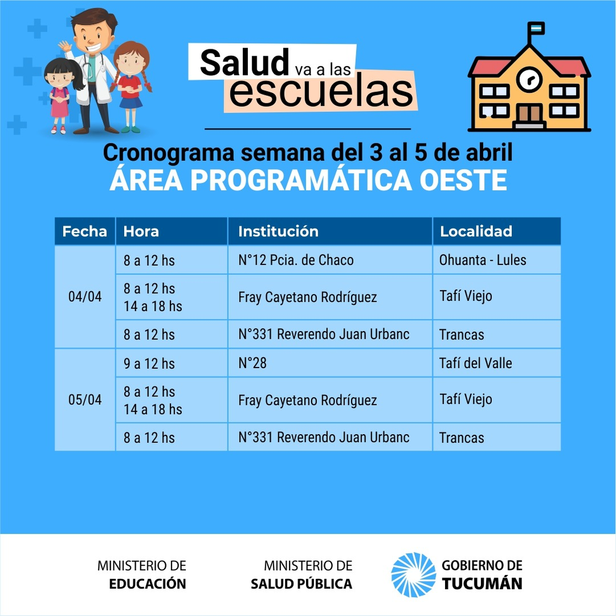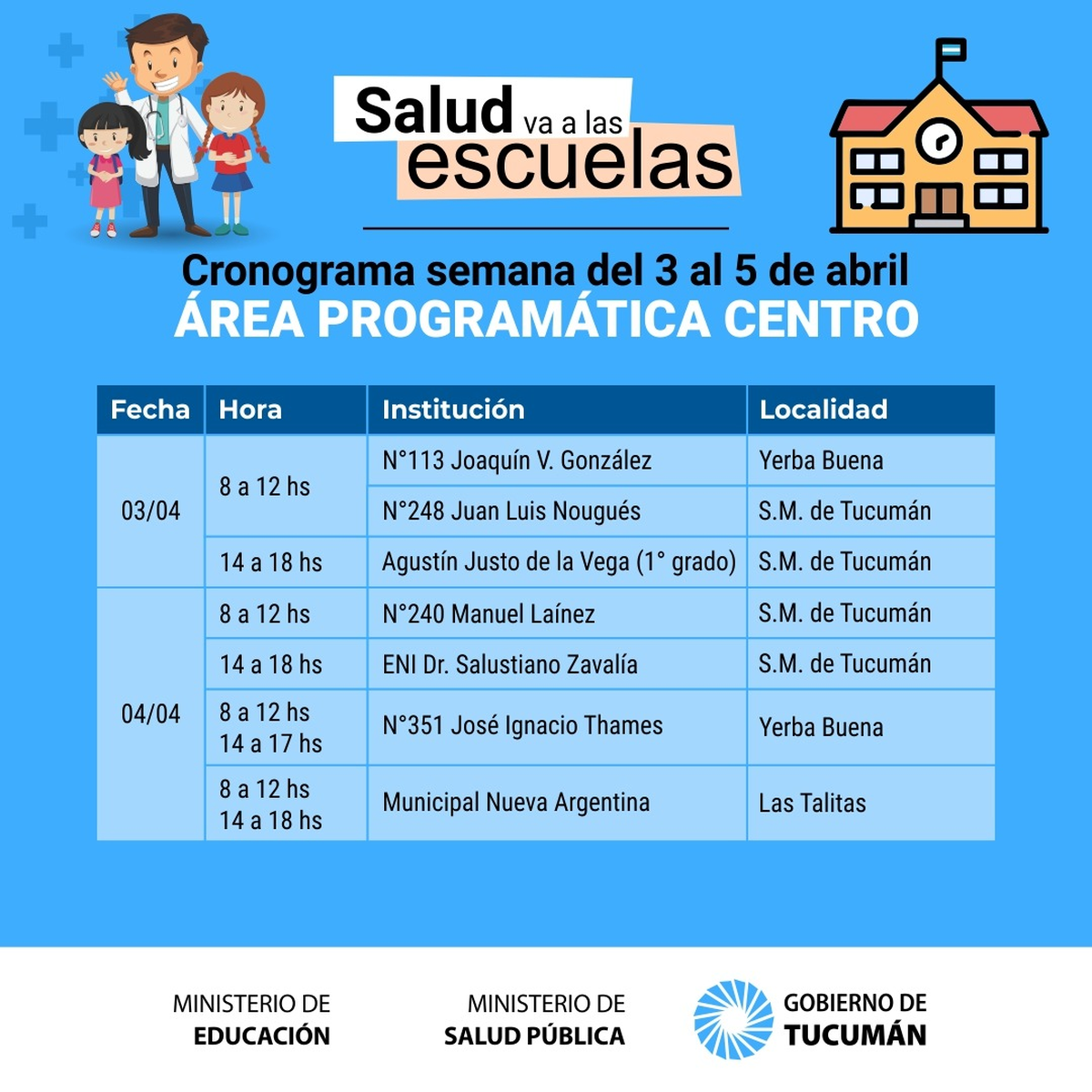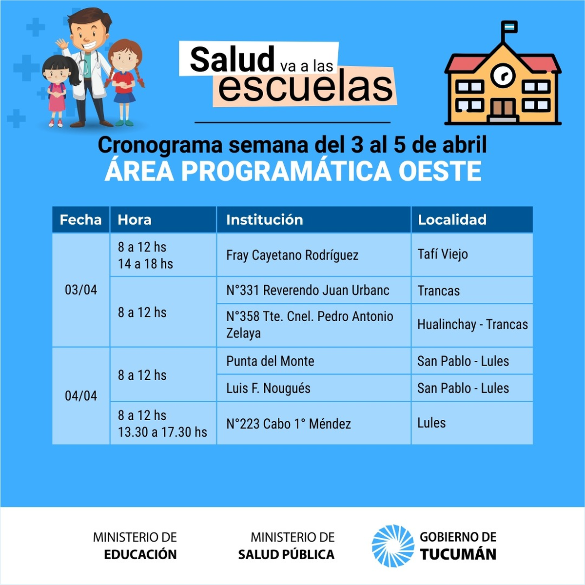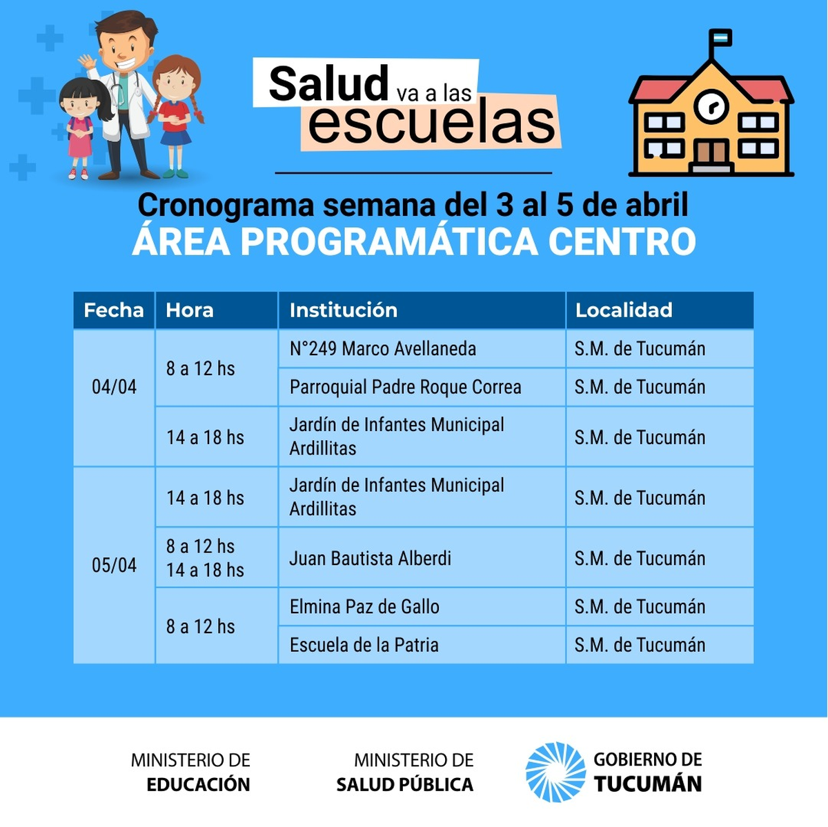 A partir de mañana y luego del feriado extralargo se retoma el operativo denominado «La Salud va a la Escuela» que permite concretar la realización de la ficha médica escolar a los alumnos de los distintos establecimientos públicos de la provincia de Tucumán.