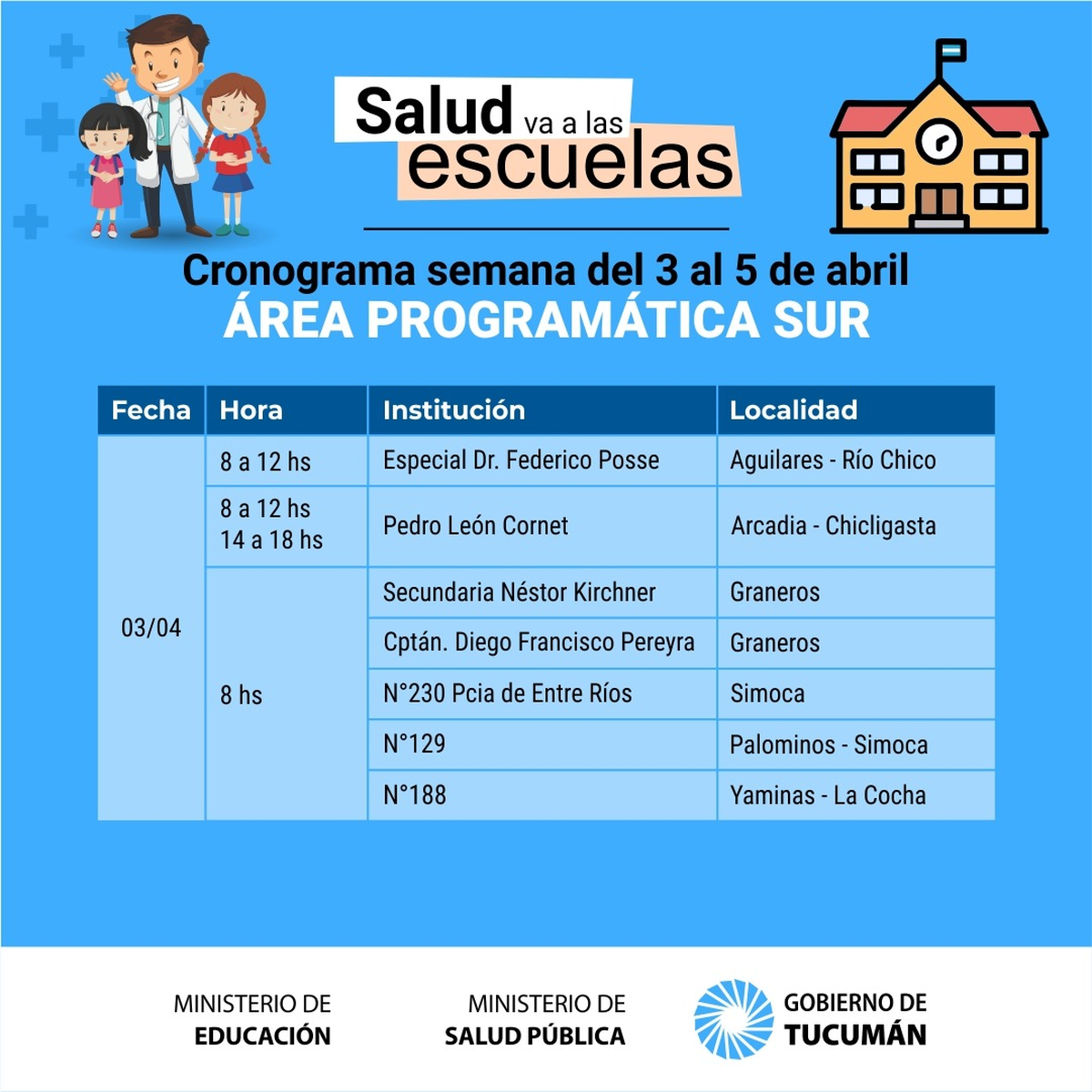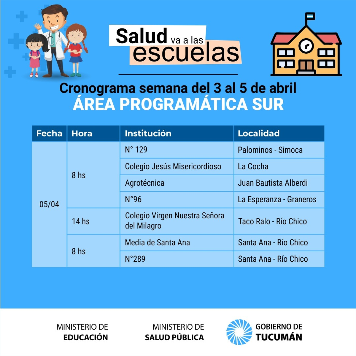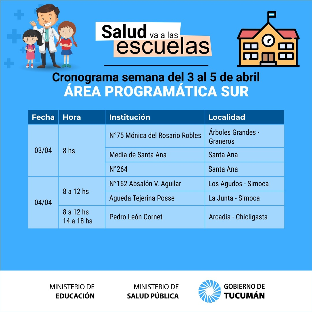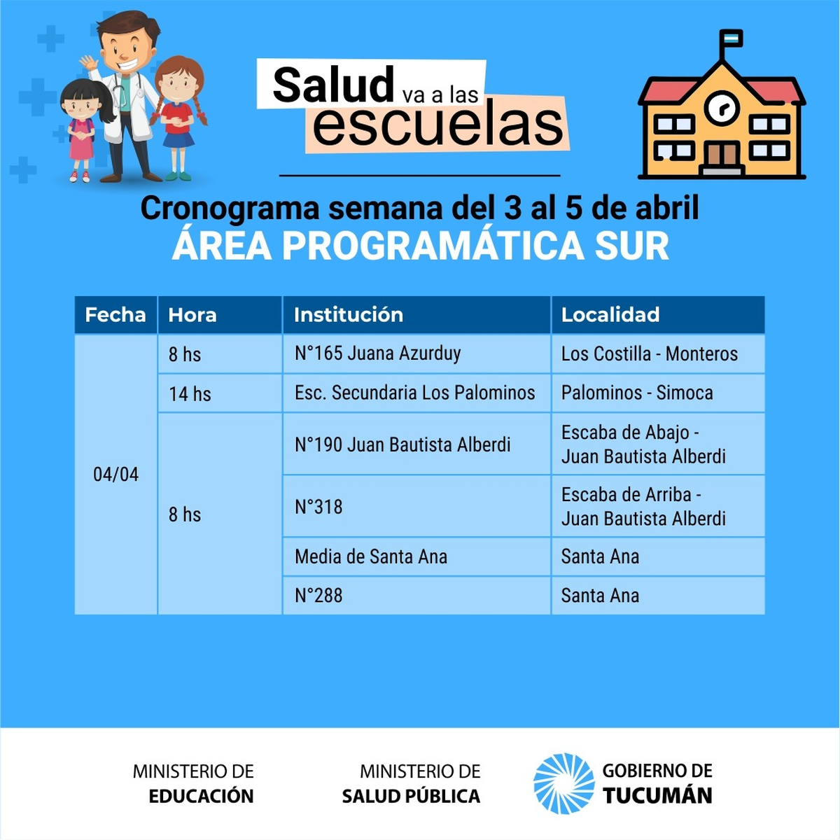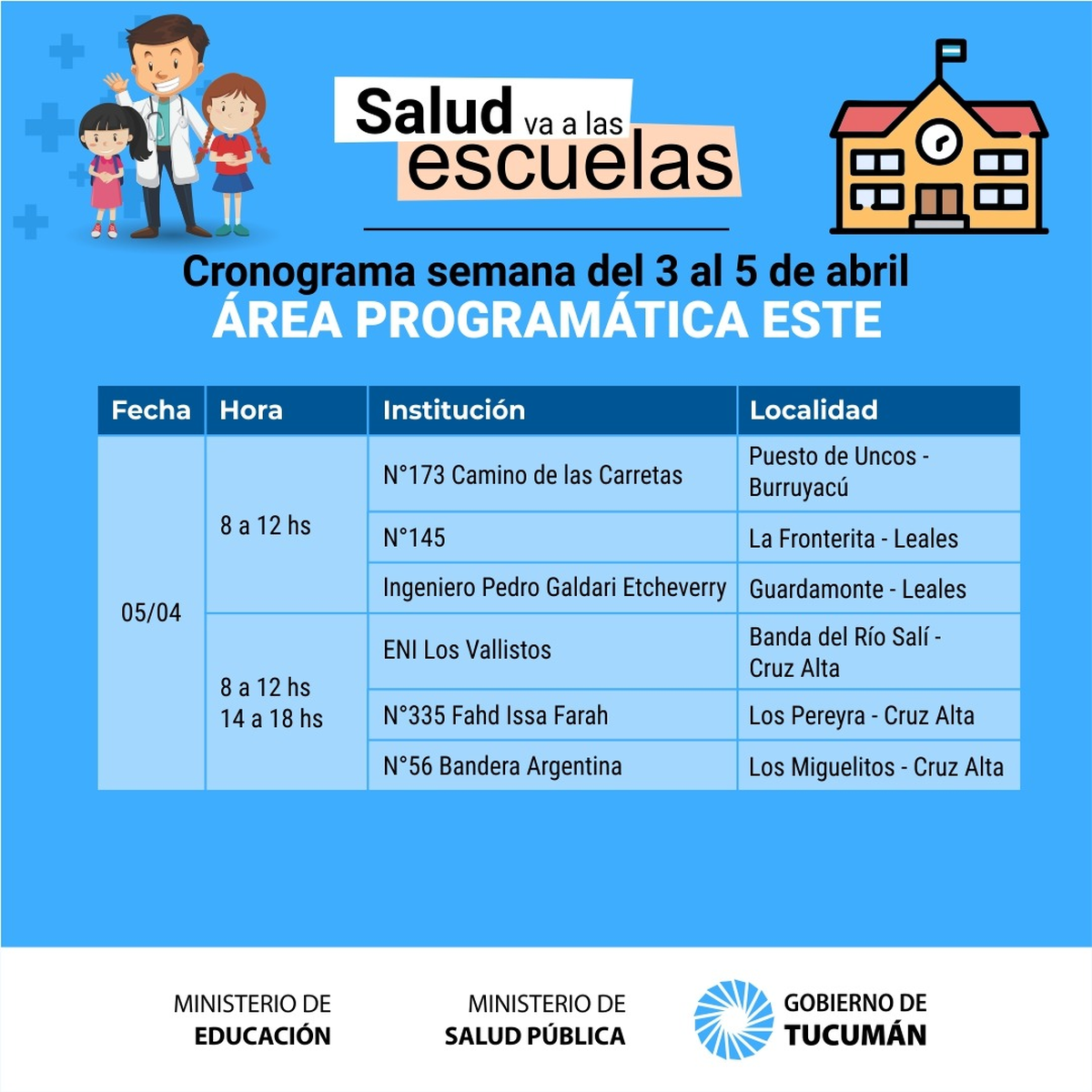 A partir de mañana y luego del feriado extralargo se retoma el operativo denominado «La Salud va a la Escuela» que permite concretar la realización de la ficha médica escolar a los alumnos de los distintos establecimientos públicos de la provincia de Tucumán.