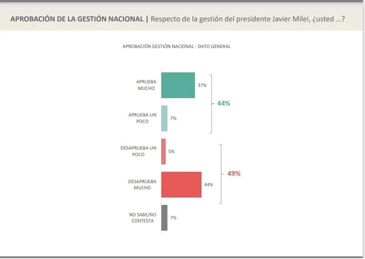 Por otro lado, la aprobación de la gestión de LLA está en el orden del 44%, compuesto por un 37% de la valoración «aprueba mucho» y un 7% que «aprueba un poco». Completa el cuadro un 7% de indecisos.
