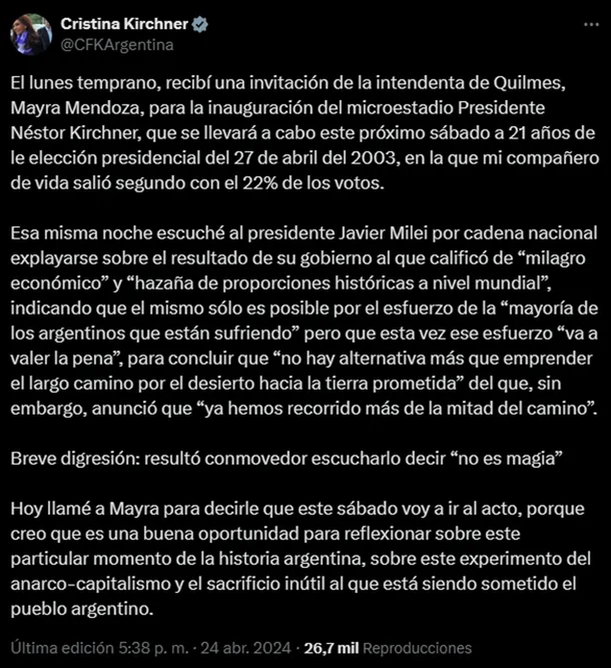 “Hoy llamé a Mayra para decirle que este sábado voy a ir al acto, porque creo que es una buena oportunidad para reflexionar sobre este particular momento de la historia argentina, sobre este experimento del anarco-capitalismo y el sacrificio inútil al que está siendo sometido el pueblo argentino”, añadió Cristina en su posteo.