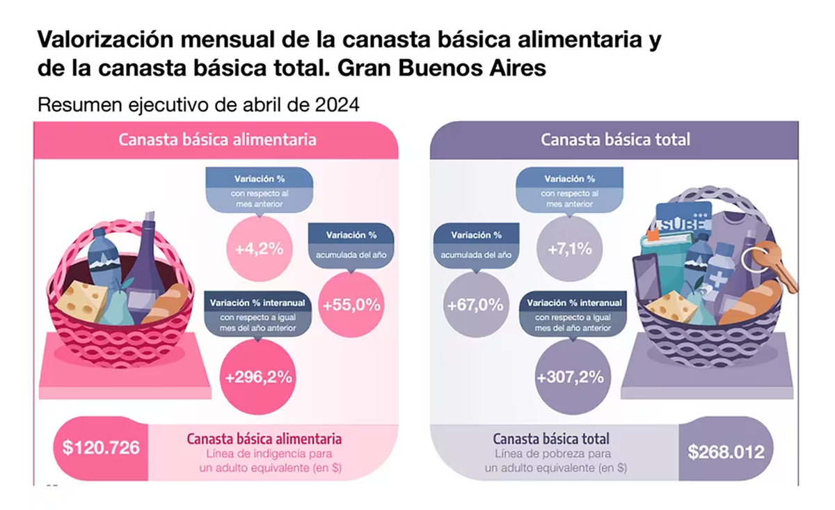 Para los próximos meses, Jorge Colina, economista y director del Instituto para el Desarrollo Social Argentino (Idesa), proyectó: “La pobreza se va a mantener alta porque la Canasta Básica Total sigue subiendo: en abril aumentó 307,2% interanual cuando el salario informal, que es la principal fuente de ingreso de los pobres, viene creciendo a razón de 130% anual. Esto mantendrá alta la pobreza en el 2024″.