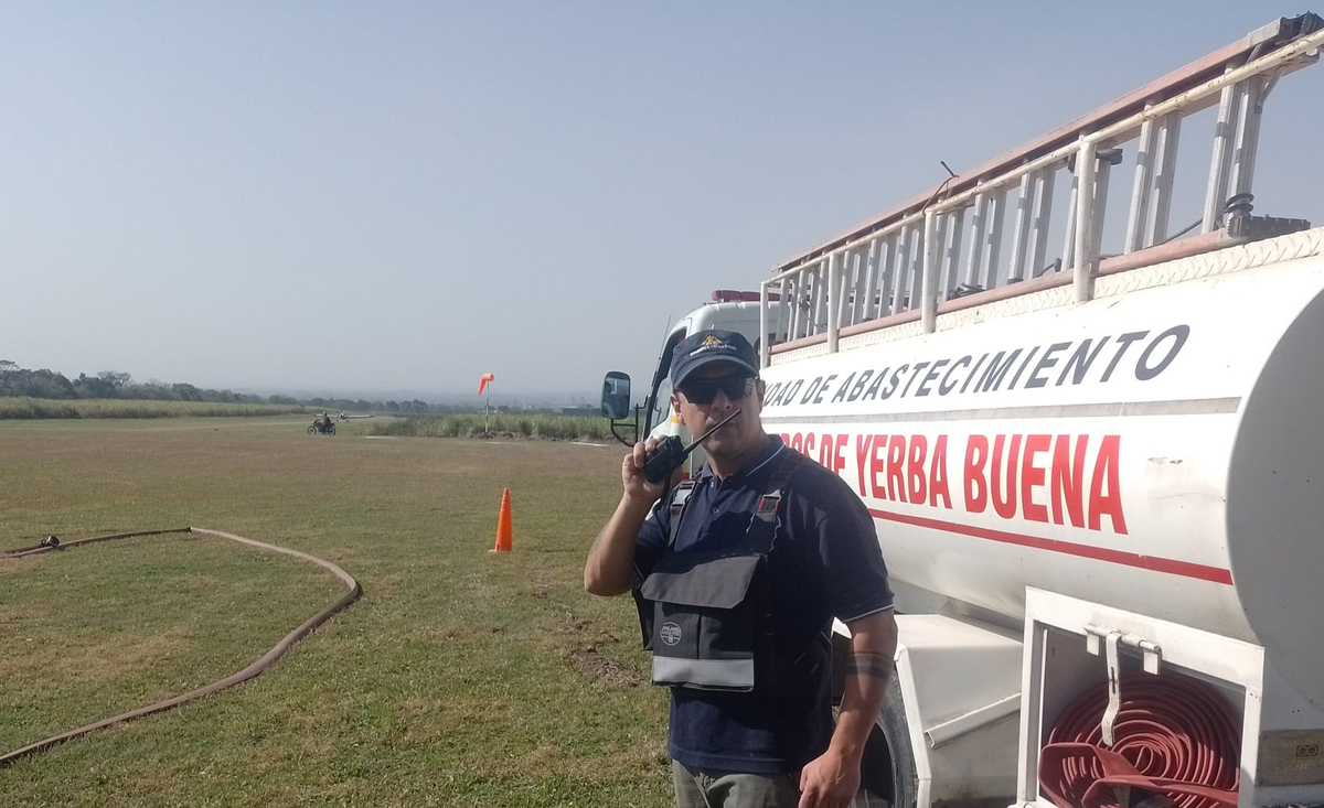 «En el segundo día consecutivo de abastecimiento al avión hidrante y extinción de los incendios en los cerros tucumanos, nuestra dotación de incendios forestales está operando en el Aeroclub Yerba Buena. Se está trabajando con una frecuencia en minutos bastante rápida entre carga y disparos en la zona afectada«.