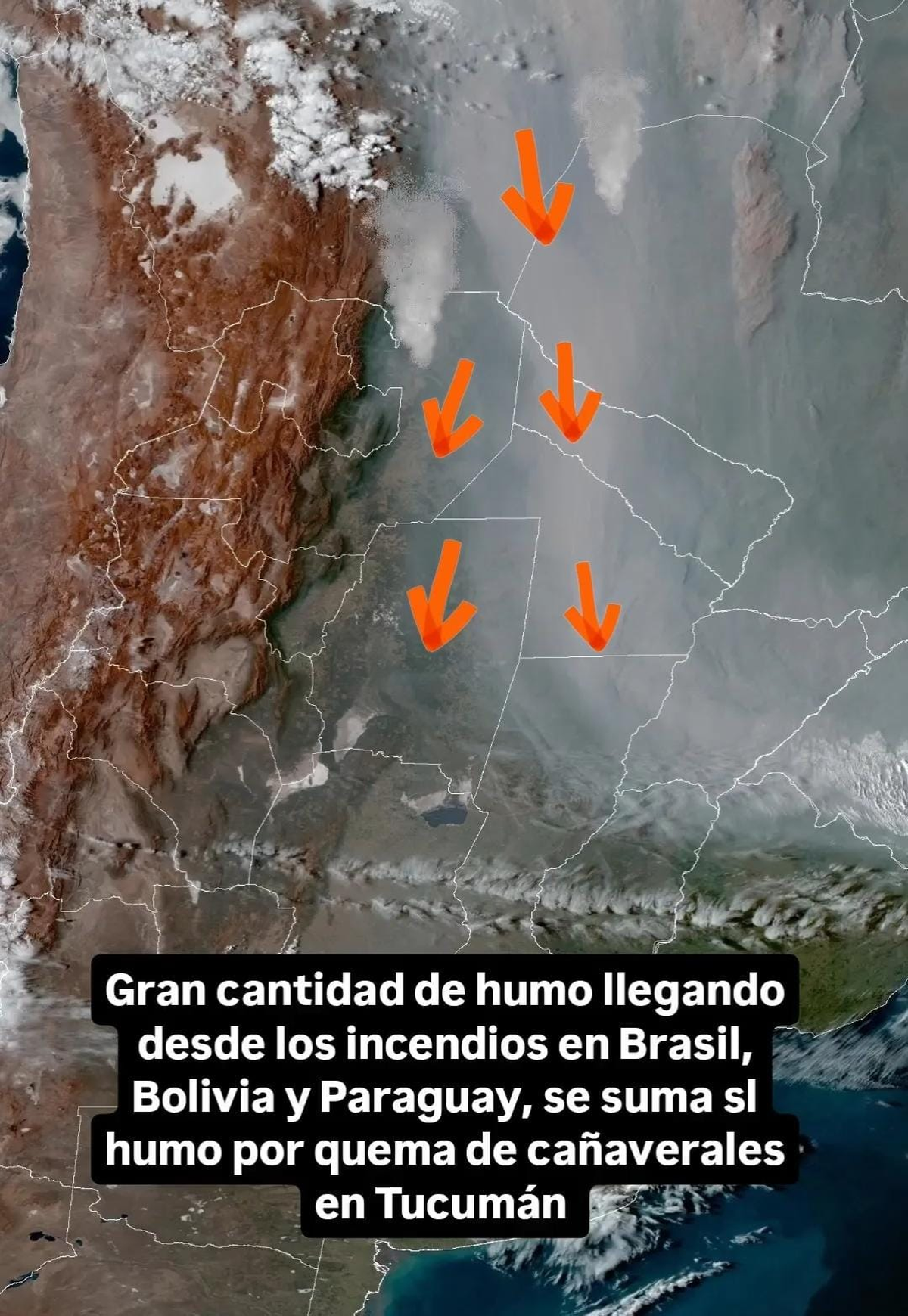 Cindy Fernández, portavoz del SMN, compartió en redes sociales una imagen del humo que está cubriendo gran parte de Sudamérica y advirtió sobre el impacto en la región. En Bolivia, el Gobierno declaró una emergencia nacional el sábado debido a los incendios forestales que consumieron casi cuatro millones de hectáreas de pastizales y bosques, la mayor cifra en el país andino este año.