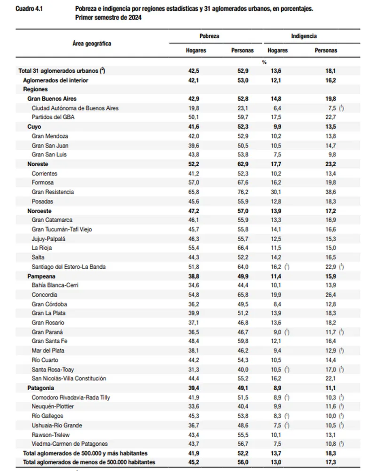En cuanto regiones más afectadas por la pobreza, el Indec señaló que las mayores incidencias de la pobreza en personas se observaron en las regiones Noreste (NEA), 62,9%; y Noroeste (NOA), 57,0%. Las menores, por su parte, se registraron en las regiones Patagonia, 49,1%; y Pampeana, 49,9%.