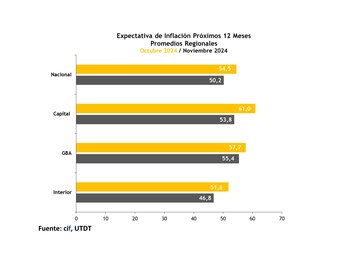 - Interior del país: se registraron las expectativas más bajas, con una inflación proyectada de 46,8%, cinco puntos porcentuales por debajo del 51,8% observado en octubre.