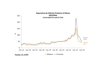 De acuerdo con la encuesta, la inflación esperada para los próximos 30 días mostró una caída, con un promedio del 5,21%, en comparación con el 5,43% registrado en octubre. A nivel anual, las expectativas también retrocedieron. La inflación esperada para los próximos doce meses se ubicó en un promedio de 50,2%, una baja de más de tres puntos porcentuales respecto al 53,8% del mes anterior.