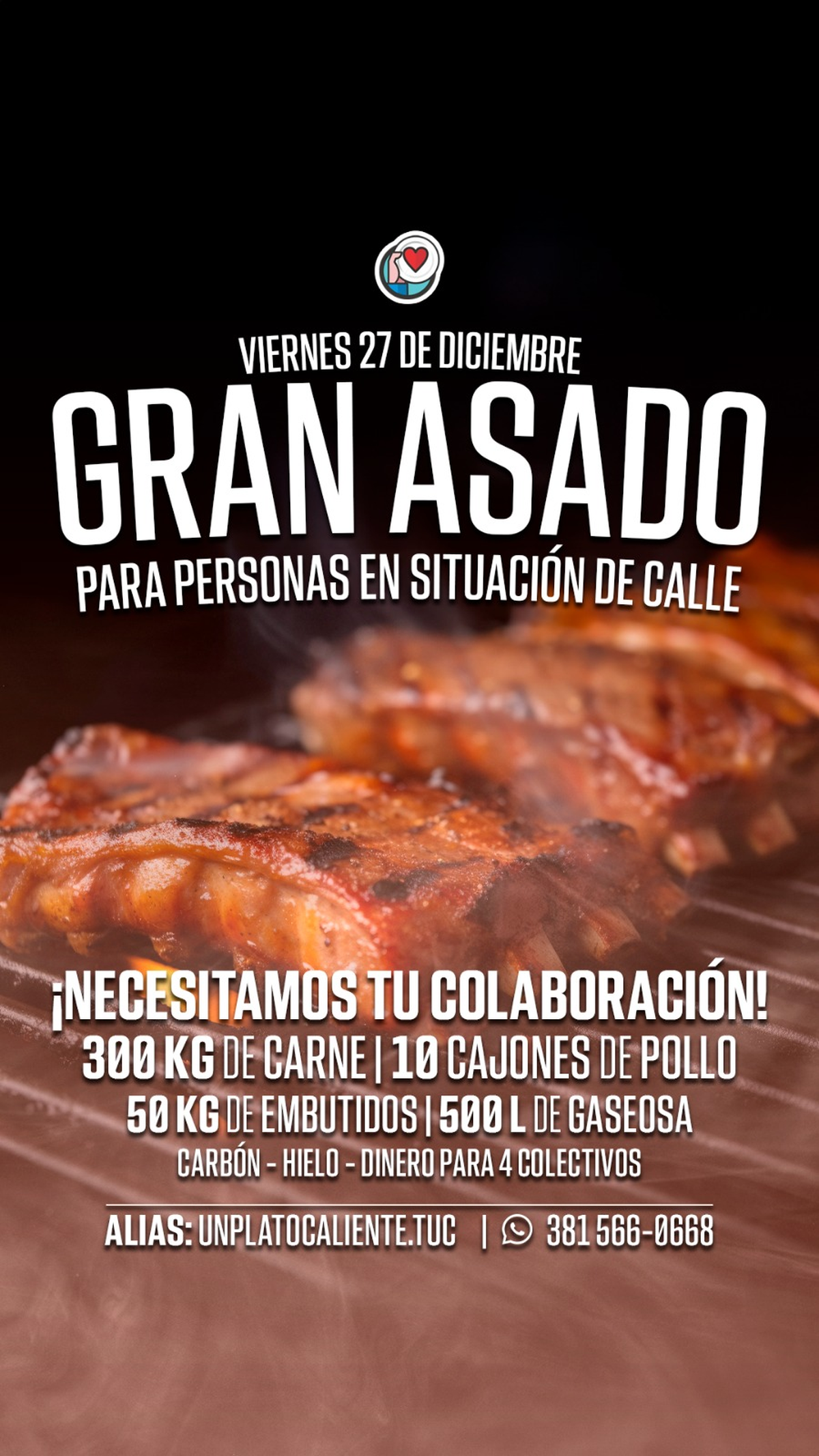 El próximo viernes 27 de diciembre, se llevará a cabo un Gran Asado para personas en situación de calle. La organización Un Plato Caliente, pide colaboración para cerrar el año de la mejor manera con los que más necesitan.