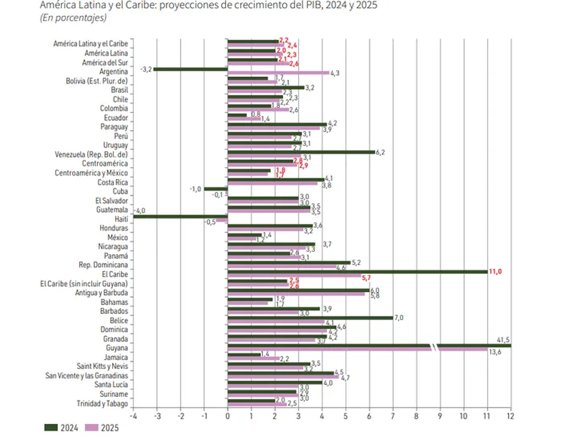 Para el próximo año, se espera que las economías sudamericanas crezcan un 2,1%, las de Centroamérica un 2,8% y las del Caribe un 11%, aunque sin incluir a Guyana, el crecimiento del PIB se limitaría al 2,5%. La Cepal anticipó que en 2025 habrá un repunte del 2,6% en Sudamérica y del 2,9% en Centroamérica. En el Caribe, el crecimiento económico para 2025 alcanzaría el 5,7%, pero sin Guyana, se reduciría al 2,6%.