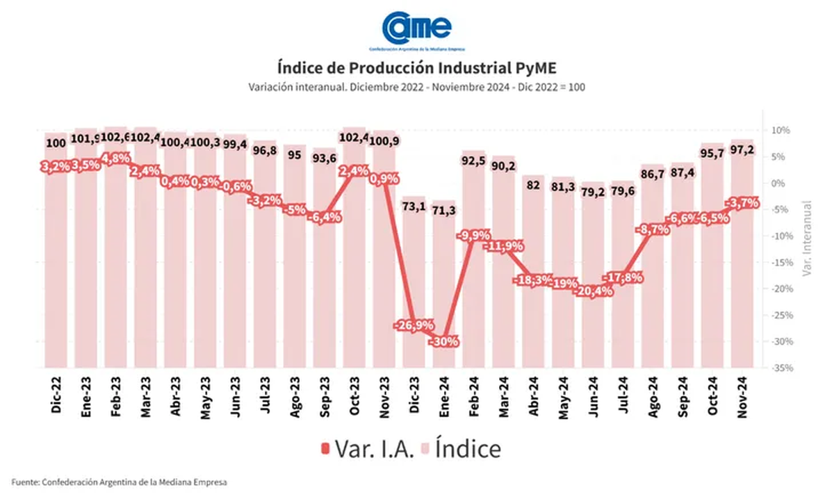 La actividad manufacturera de las pymes descendió 3,7% anual en noviembre y acumula una retracción de 13,6% en los primeros once meses del año frente al mismo período de 2023. De los 6 sectores relevados, 2 mejoraron su actividad en la comparación anual y 4 se retrajeron.