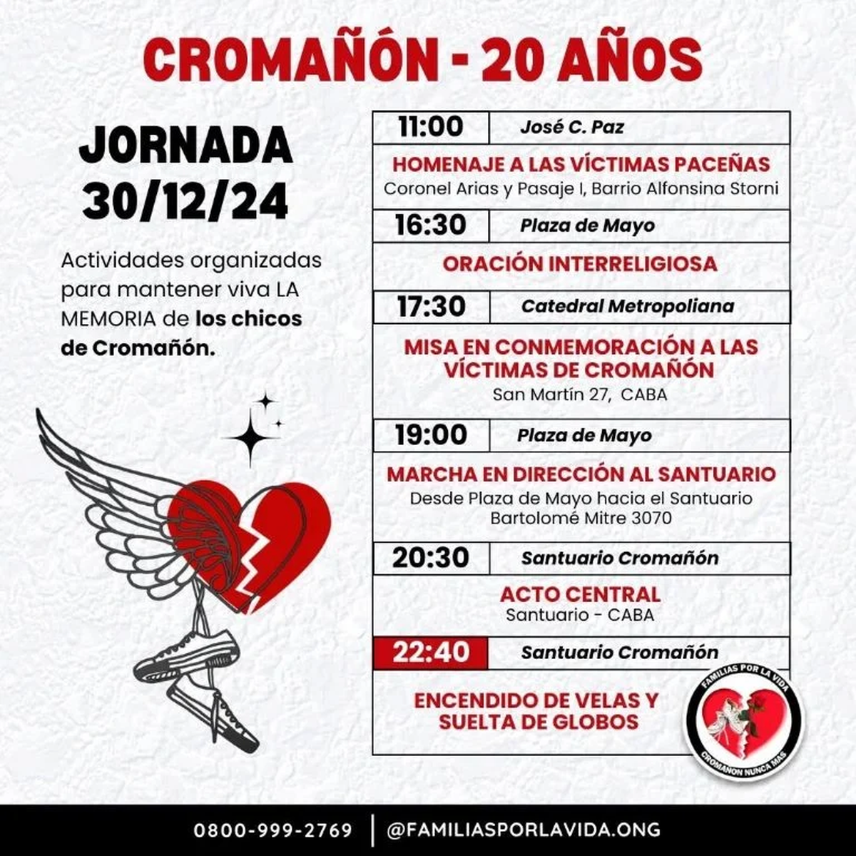 A las 16.30 en Plaza de Mayo se producirá una oración interreligiosa y la lectura de un documento por parte de la organización, acompañado ese momento de música en vivo y una emotiva suelta de zapatillas, elemento icónico de la lucha por el esclarecimiento judicial de los responsables de la tragedia.