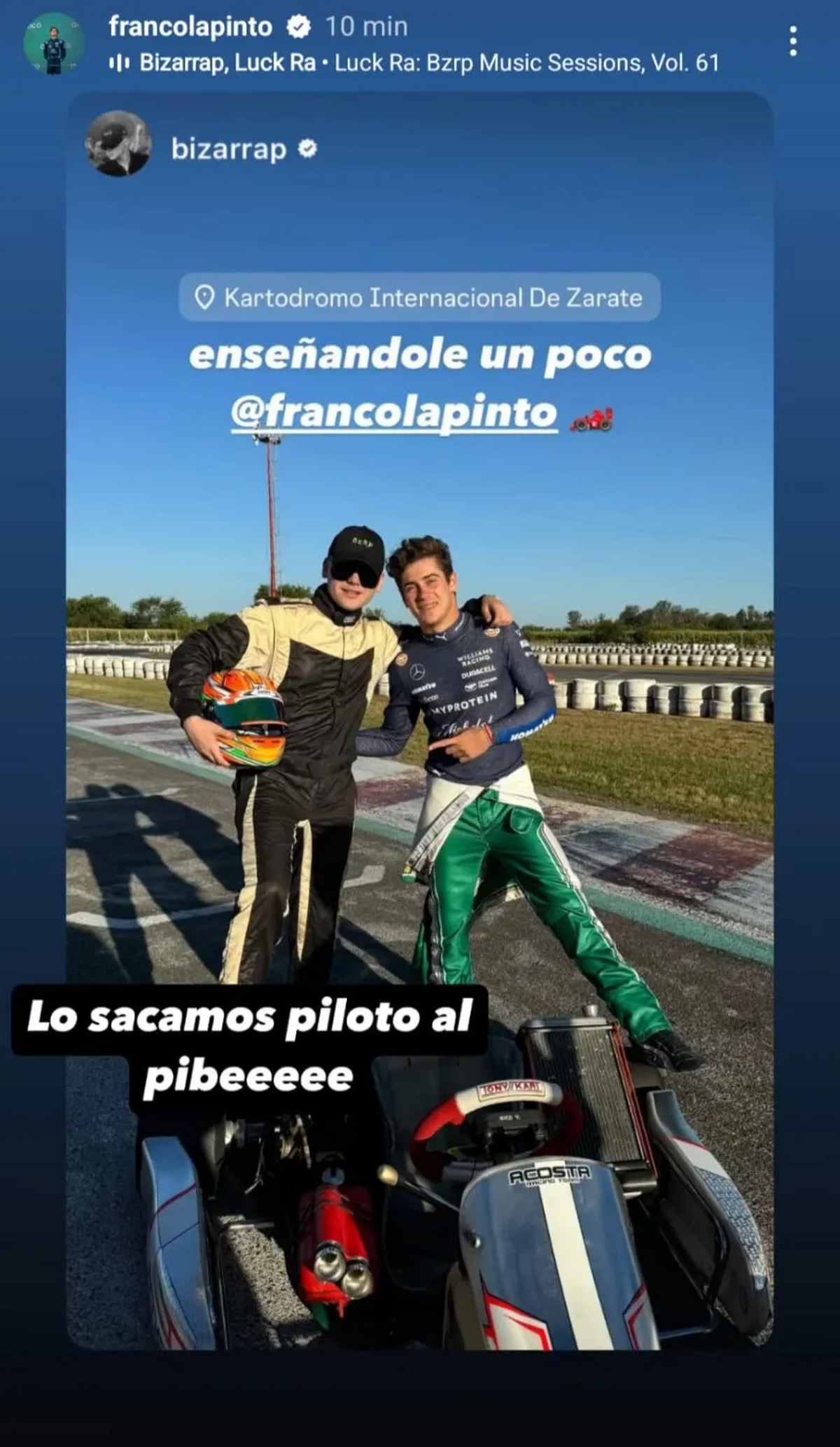 El piloto y el productor musical se juntaron en un ambiente más cercano al oriundo de Pilar, ya que la cita tuvo lugar en el Kartódromo Internacional de Zarate en la provincia de Buenos Aires; circuito donde se animaron a competir entre sí. Luego del encuentro ambos inmortalizaron con fotos juntos e intercambios en redes sociales, compartiendo las postales con chistes de uno para el otro.
