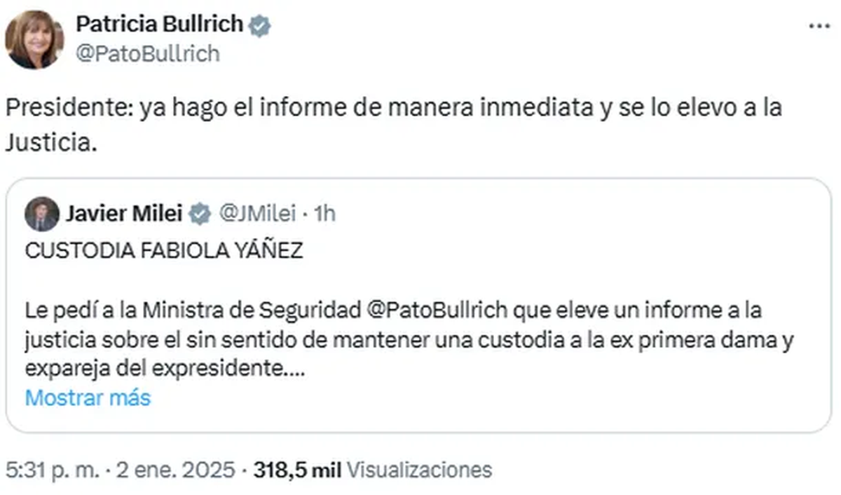 Fiel a su estilo de «recorte» y «ajuste», Javier Milei se muestra implacable con lo que él considera «gastos innecesarios» del Estado. En este sentido, el primer mandatario lanzó en sus redes sociales un pedido para Patricia Bullrich, que involucra a Fabiola Yañez: «Le pedí a la ministra de Seguridad que eleve un informe a la Justicia sobre el sin sentido de mantener una custodia a la exprimera dama y expareja del expresidente», comenzó indicando en su cuenta de X.
