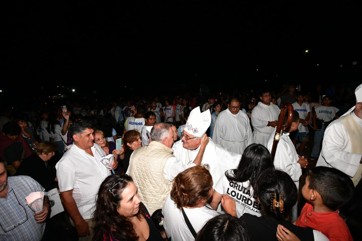 «No solo vinimos a escuchar la misa, sino presenciamos la escenografía por lo que en nombre del Gobierno les doy mis felicitaciones, muchas gracias por el esfuerzo a pesar de la lluvia y que la Virgen de Lourdes derrame bendiciones a este pueblo argentino».