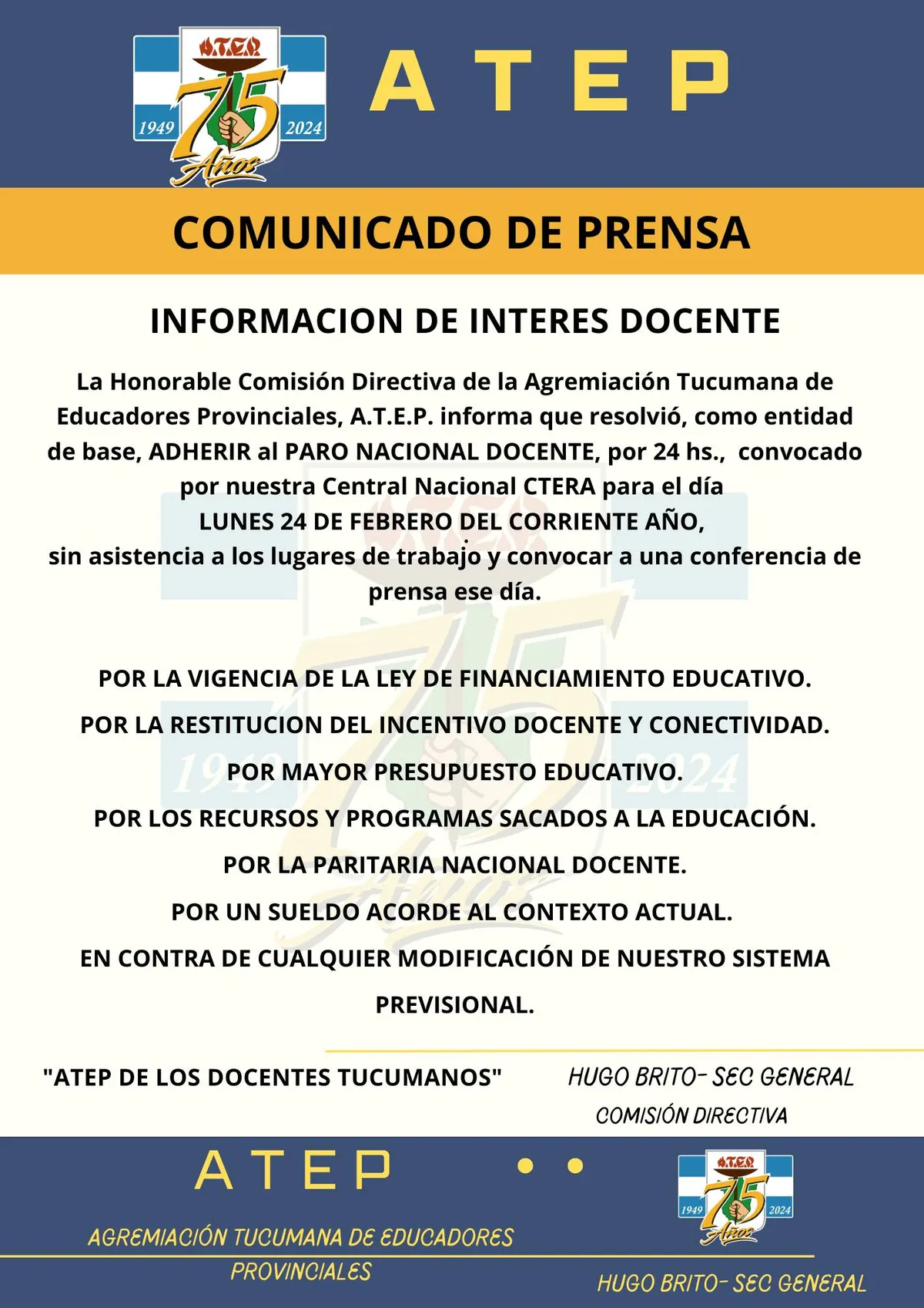 La Agremiación Tucumana de Educadores Provinciales (ATEP) confirmó que se sumará al paro docente nacional del lunes 24 de febrero, convocado por la Confederación de Trabajadores de la Educación de la República Argentina (CTERA). La medida de fuerza, que se extenderá por 24 horas y será sin asistencia a los lugares de trabajo, responde a la falta de convocatoria del Gobierno a la Paritaria Nacional Docente.