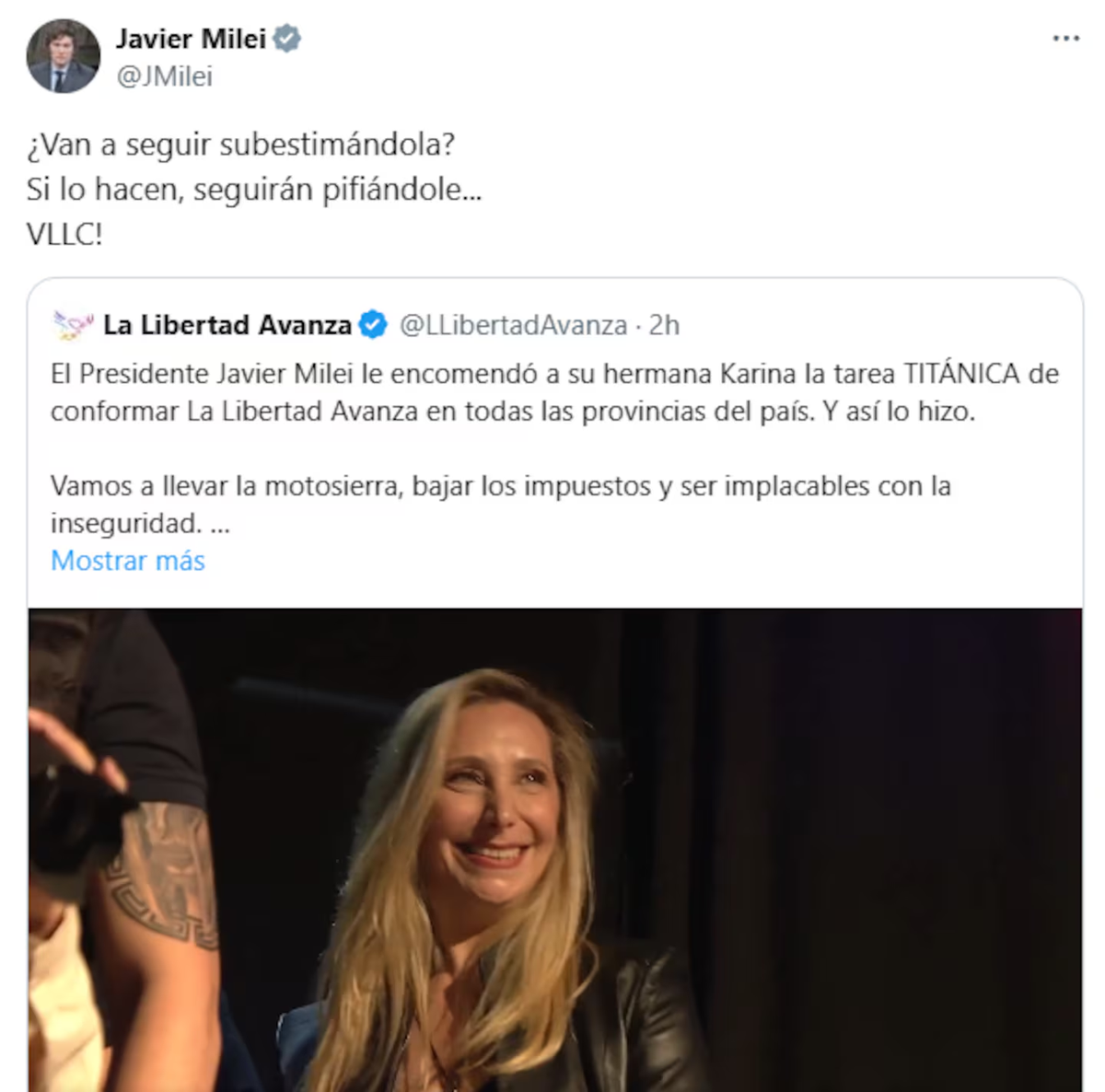 Desde la cuenta oficial de LLA, se reivindicó el rol de Karina en la consolidación del espacio libertario: “El presidente Javier Milei le encomendó a su hermana Karina la tarea titánica de conformar La Libertad Avanza en todas las provincias del país. Y así lo hizo. Vamos a llevar la motosierra, bajar los impuestos y ser implacables con la inseguridad. ¡Viva la libertad carajo!”