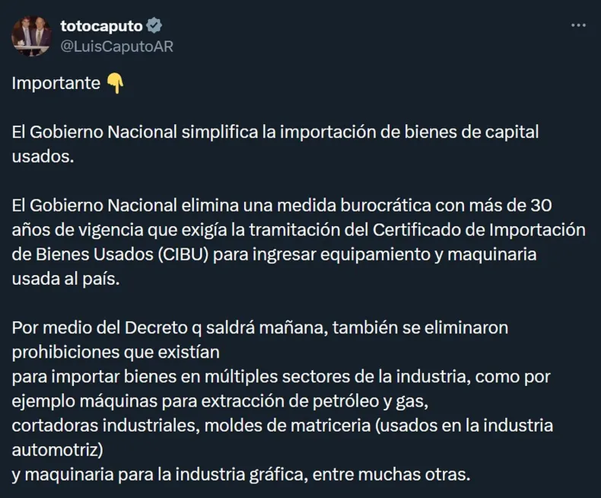«Por medio del Decreto que saldrá mañana, también se eliminaron prohibiciones que existían para importar bienes en múltiples sectores de la industria, como por ejemplo máquinas para extracción de petróleo y gas, cortadoras industriales, moldes de matricería (usados en la industria automotriz) y maquinaria para la industria gráfica, entre muchas otras», describió el economista en redes sociales.