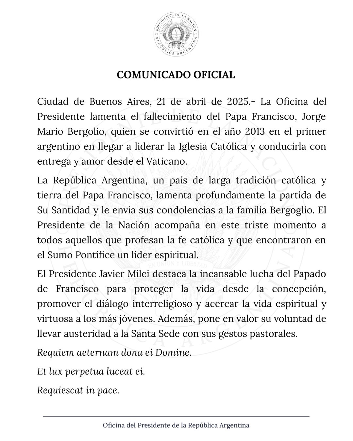 “El Presidente de la Nación acompaña en este triste momento a todos aquellos que profesan la fe católica y que encontraron en el Sumo Pontífice un líder espiritual”, señala el texto. “Se convirtió en el año 2013 en el primer argentino en llegar a liderar la Iglesia Católica y conducirla con entrega y amor desde el Vaticano”, se apuntó.
