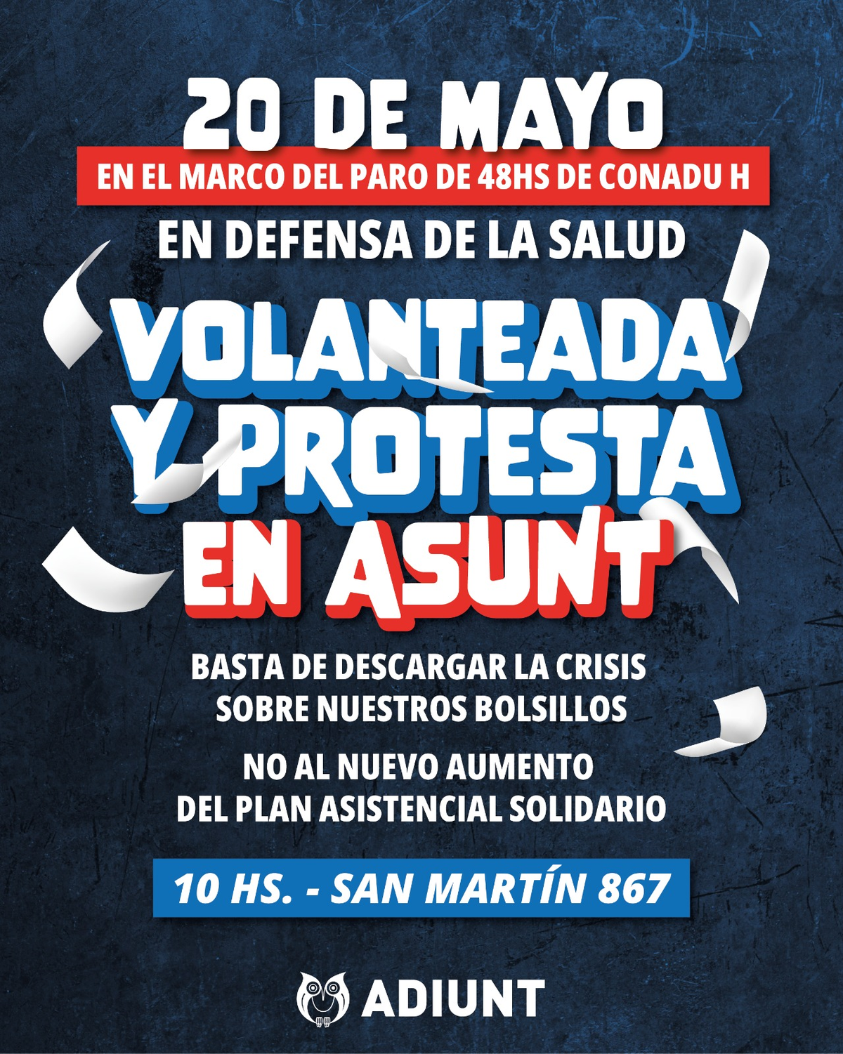 «Vamos a convocar a las 10 en la obra social de los docentes universitarios (ASUNT) para reclamar ante el incremento. El Plan de Asistencial Solidario ha incrementado prácticamente un 200% desde el año pasado mientras nuestro salario ha subido sólo un 90%», explicó Rodríguez.