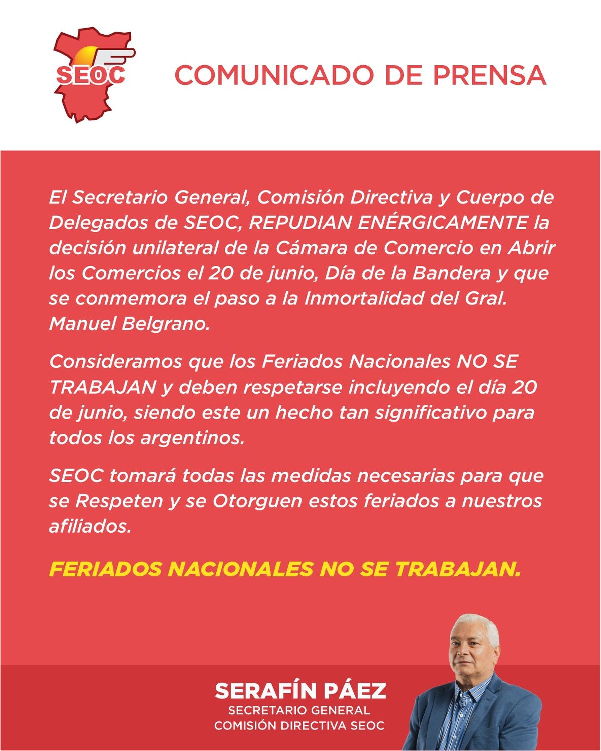 El próximo 20 de junio de 2025, se conmemora en Argentina el Día de la Bandera y el Paso a la Inmortalidad del General Manuel Belgrano, y este día será un feriado nacional inamovible, según confirmó el presidente Javier Milei. Por este motivo, el Secretario General, la Comisión Directiva y el cuerpo de delegados de SEOC, emitieron un comunicado repudiando la decisión de la Cámara de Comercio de San Miguel de Tucumán, de abrir las puertas de los comercios este lunes.