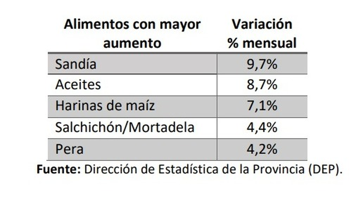La variación de la CBA y de la CBT, con respecto al mismo mes del año anterior, es de 29,4% y 30,6% respectivamente. Los 5 alimentos que mayor variación presentaron en comparación del mes pasado fueron: