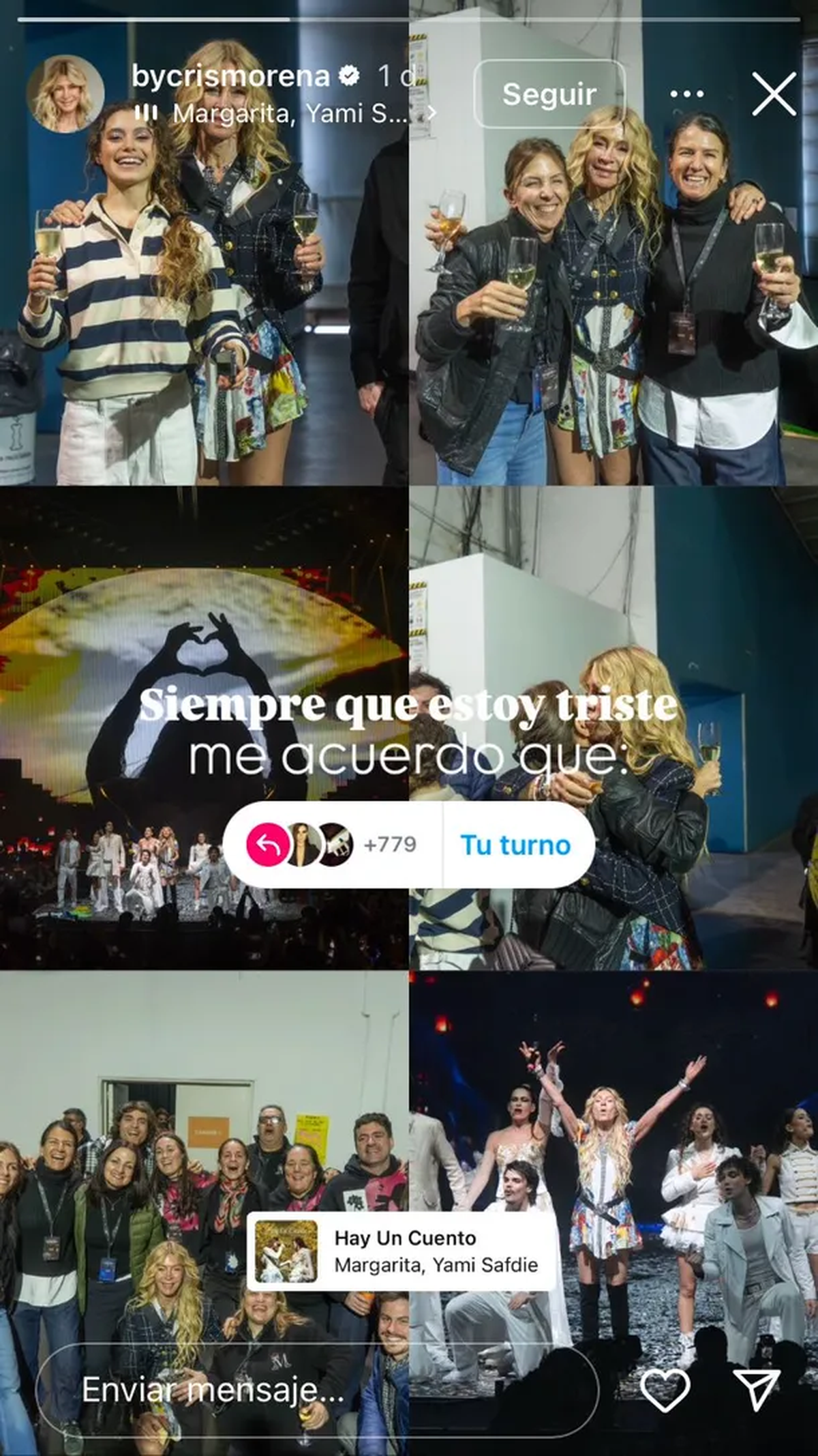 «Siempre que estoy triste me acuerdo que…», señala el posteo de la reconocida productora, en una historia de Instagram donde se pueden ver seis fotos de los shows de «Margarita» -su más reciente y exitosa producción televisiva-, a modo de festejo por los 230 mil espectadores que ya habían visto su espectáculo. De esta manera, Cris se sumó a un trend de la red social de fotos que citaba esa frase e invitaba a ocar imágenes de momentos felices.
