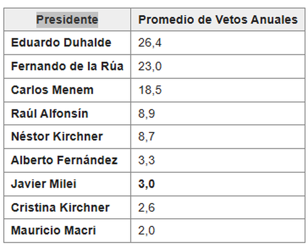 El ranking de vetos por promedio anual (1983-2025)