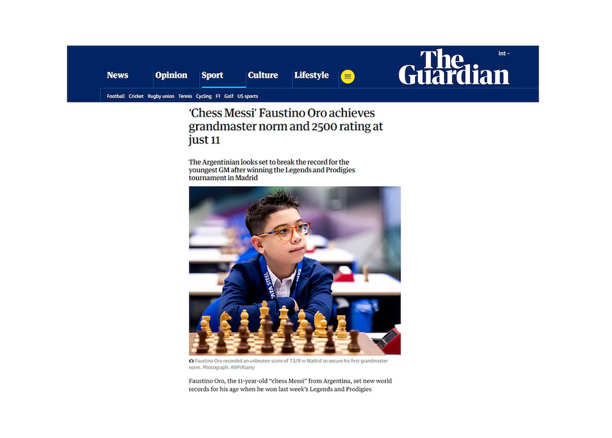 El medio británico lo define como el “Messi del ajedrez” y destaca que se convirtió en el primer jugador menor de 12 años en superar los 2500 puntos de rating internacional, un logro estadístico que ningún otro ajedrecista había conseguido a esa edad. El informe de este medio subraya el desempeño de Oro durante el torneo “Leyendas y Prodigios” disputado en Madrid, donde el argentino consiguió una puntuación invicta de 7.5 sobre 9, adjudicándose así una de las tres normas necesarias para alcanzar el máximo título del ajedrez mundial.