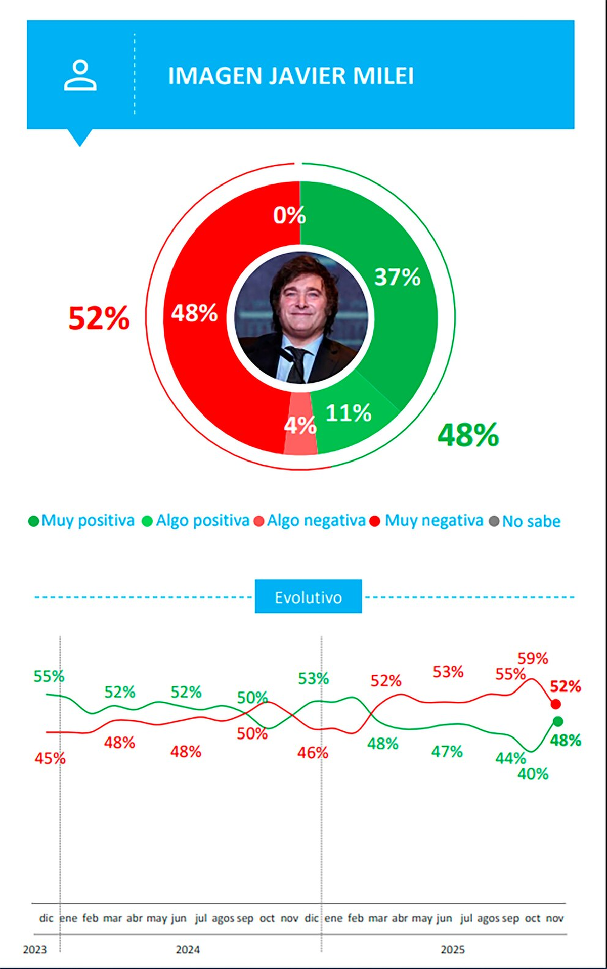 El estudio indica que después del triunfo electoral se recompusieron significativamente las expectativas en torno al Gobierno nacional y la imagen positiva de Javier Milei creció ocho puntos después de cuatro meses consecutivos de caída. También bajó su imagen negativa: ahora, el presidente tiene, según Opina Argentina, 48% de valoración en su favor y 52% en contra. De todas maneras, el saldo aún se mantiene levemente negativo.