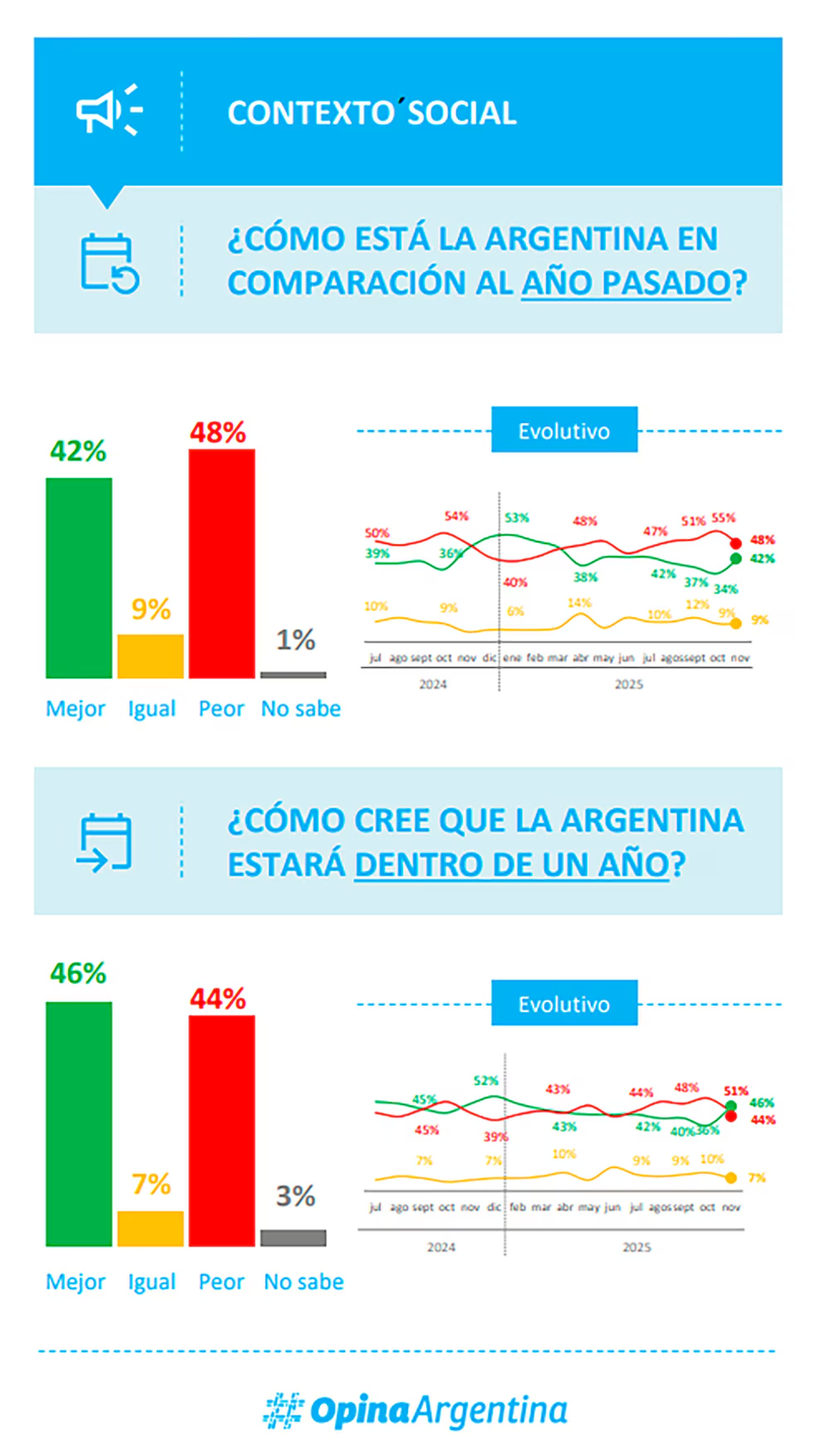 Ante la pregunta “¿Cómo cree que la Argentina estará dentro de un año?“, el 46% de los encuestados respondió que ”mejor» y el 44%, todo lo contrario: “peor”. En este caso, también se modificó la tendencia evolutiva y las esperanzas de un futuro más próspero sumaron un 12% de representatividad respecto de octubre pasado.