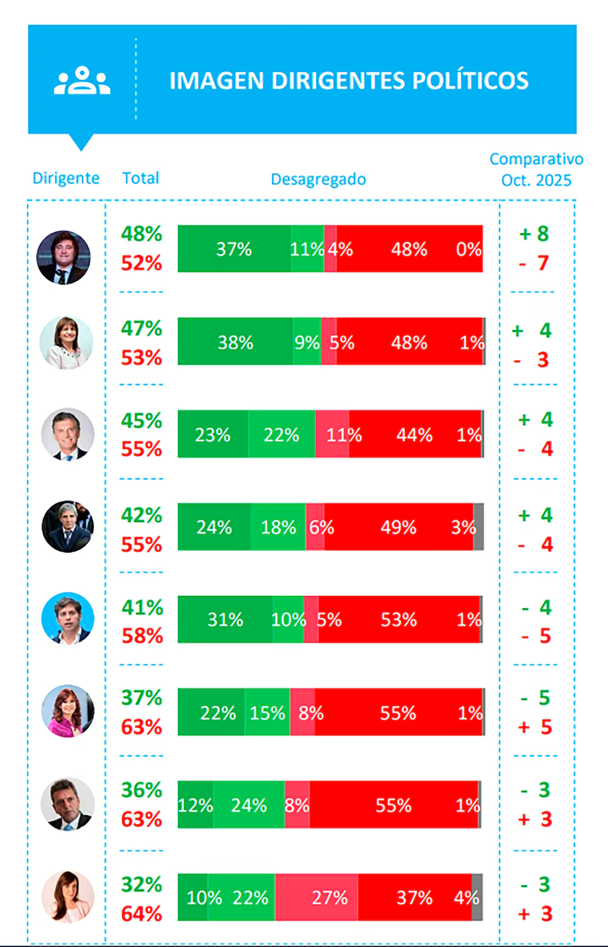 Luego vienen Mauricio Macri (45% y 55%), el ministro de Economía Luis Caputo (42% y 55%), Axel Kicillof (41% y 58%), Cristina Kirchner (37% y 63%), Sergio Massa (36% y 63%) y Victoria Villarruel (32% y 64%).