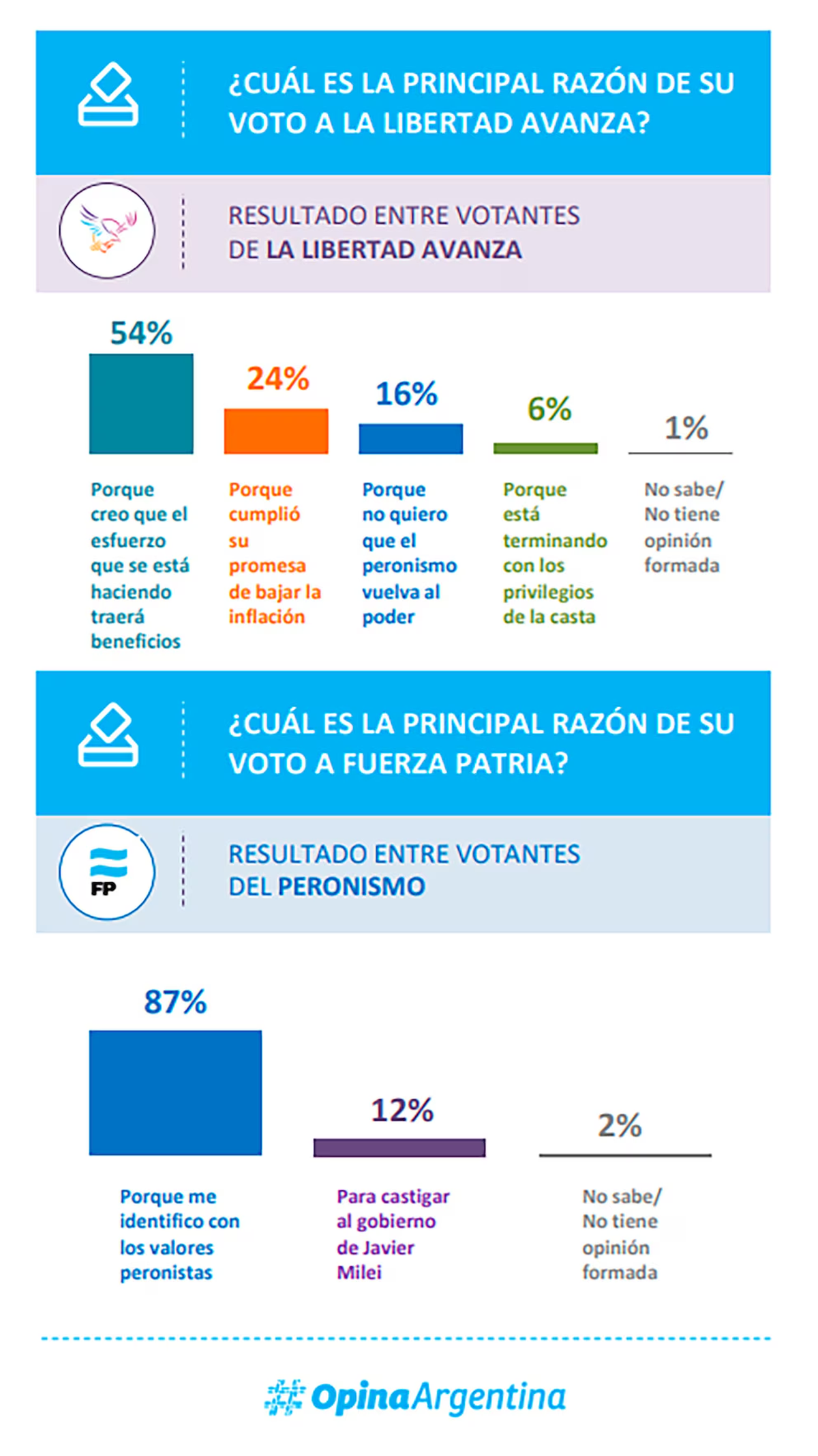 Entre los votantes de La Libertad Avanza, la principal causa de su voto fue, según respondieron a Opina Argentina, la expectativa de que el esfuerzo que se está haciendo traerá beneficios. Ante la pregunta “¿Cuál es la principal razón de su voto a LLA?“, el 54% respondió en ese sentido, mientras que el 24% lo hizo ”porque cumplió su promesa de bajar la inflación”; 16% porque “no quiero que el peronismo vuelva al poder”; y 6% porque “está terminando con los privilegios de la casta”.