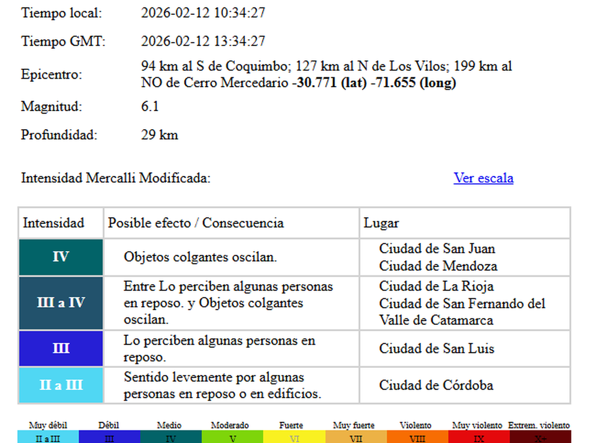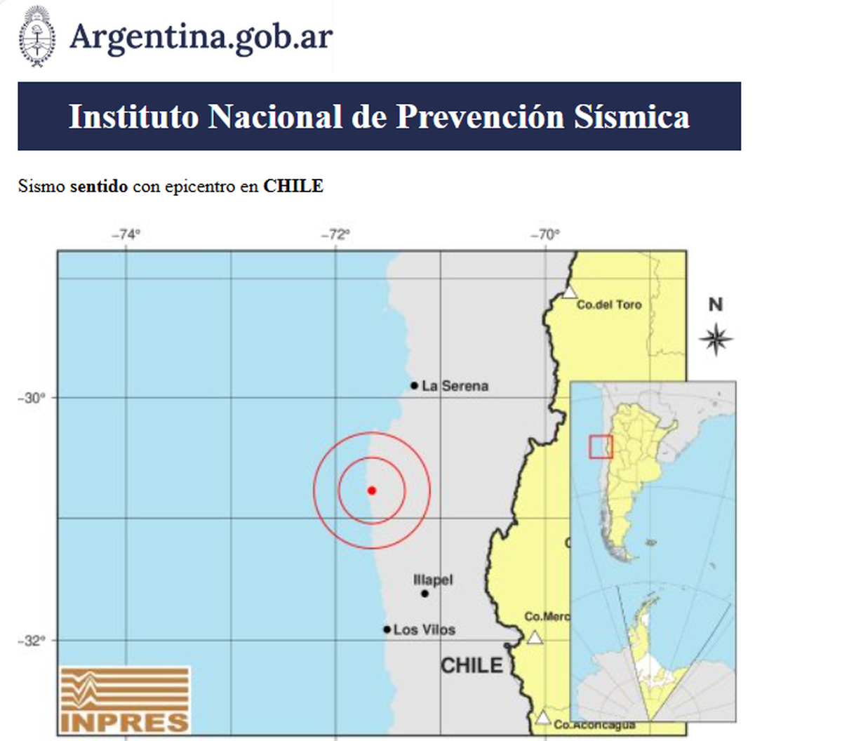 De acuerdo al Inpres el temblor fue de una magnitud 6.1 y a una profundidad de 29 km. El epicentro fue a 94 km al S de Coquimbo; 127 km al N de Los Vilos; 199 km al NO de Cerro Mercedario -30.771 (lat) -71.655 (long).