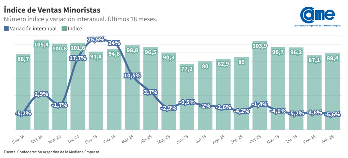 CAME informó que la variación mensual de las ventas minoristas evidenció un incremento del 2,6%. El indicador acumula una baja del 5,2% en lo que va del año.