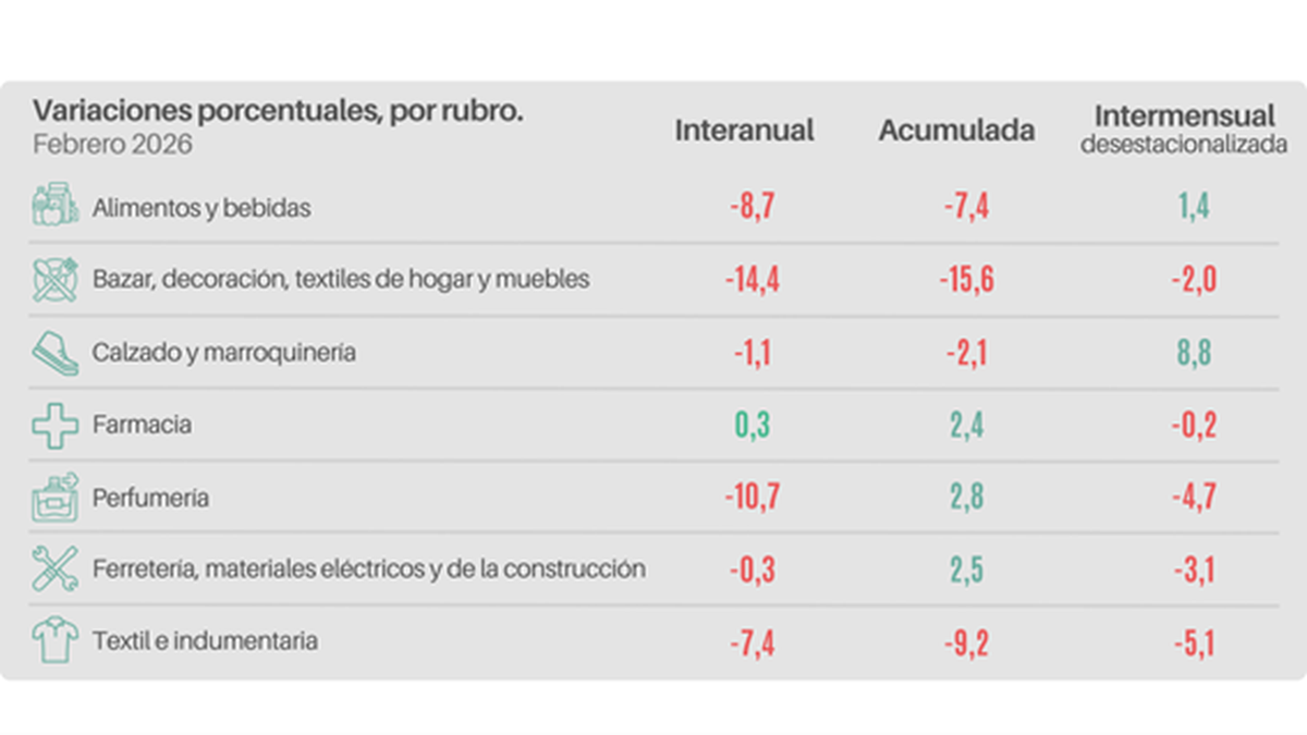 El relevamiento por rubros ratificó el proceso de contracción: seis de los siete sectores monitoreados cerraron con resultados negativos. Las bajas se encontraron en Bazar y decoración (-14,4%), Perfumería (-10,7%) y Alimentos y bebidas (-8,7%). Farmacia constituyó la excepción, con un incremento del 0,3% interanual.